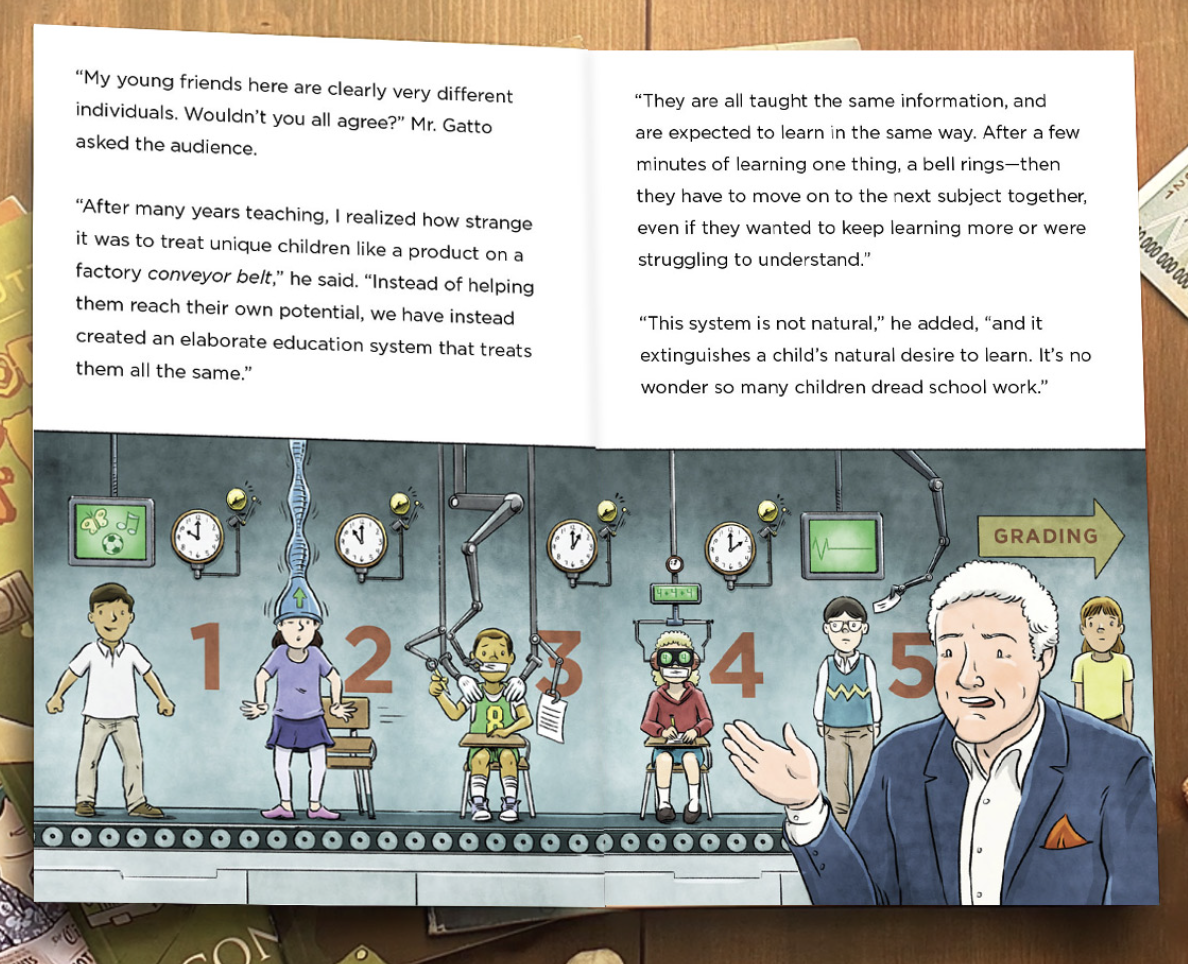 And so, public education was born. But it wasn’t designed to be a place where kids could learn and grow and explore their interests. It was designed to be a place where kids could be molded into the kind of workers that the factories needed.