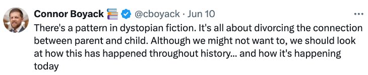One genre that I’ve realized has pretty constant anti-family messaging is dystopian fiction. In almost all of these stories, there is a systematic effort by some group or individual to sever the connection between parent and child.